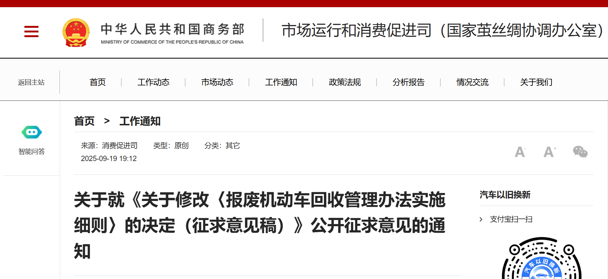 了解更多關于就《關于修改〈報廢機動車回收管理辦法實施細則〉的決定(征求意見稿)》公開征求意見的通知